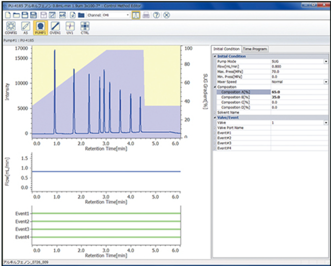 The pump flow rate and gradient profile display is flexible and can be overlaid with a chromatogram for adjusting gradient conditions.
