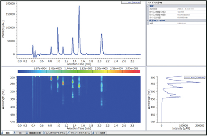 PDA data processing is included as standard. Data is displayed in 2-D and 3-D contour plot with simultaneous overlay of spectra and chromatograms. Extract chromatograms at single or multiple wavelengths for quantitation.