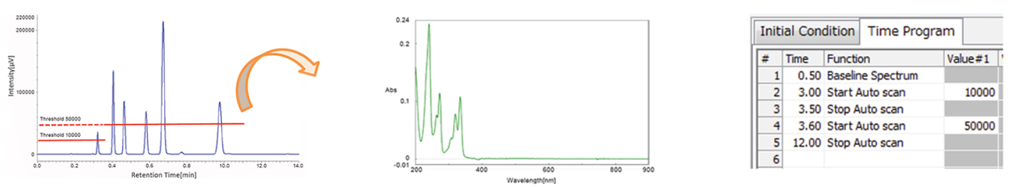 → Both detectors include dual-wavelength data acquisition (up to 100Hz for UHPLC) and spectral scanning. Spectral scanning can be executed automatically in ChromNAV CDS, by time or by height when a peak exceeds a set threshold.