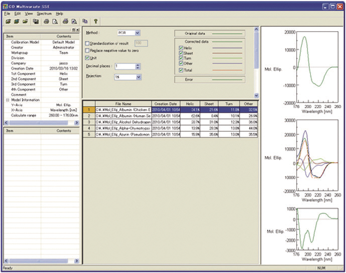 Quantitative multivariate analysis (PCR/PLS) program for the estimation of protein secondary structures from CD spectra. The reference data set supplied includes 26 proteins and is flexible to allow the user to add additional proteins as desired or even create an entirely new reference data set.