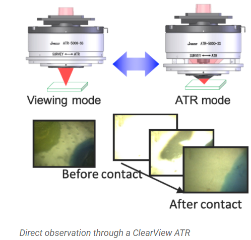 The unique ClearView ATR developed by JASCO has overcome this limitation and it is now possible to observe the sample directly though the ATR, which is then moved into direct contact for measurement at exactly the same position.
