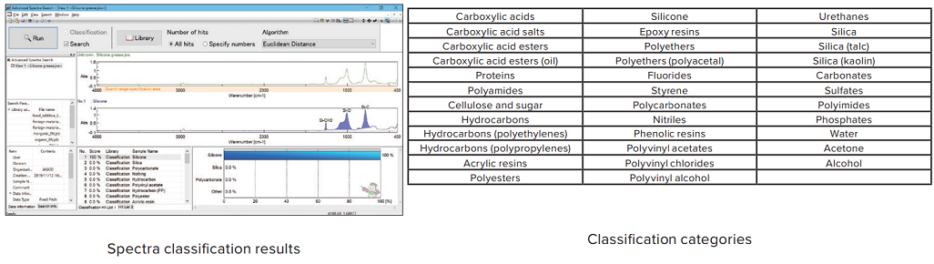 Spectra search support program makes it possible for anyone to perform spectral analysis like an expertise operator. An epoch-making search program that uses machine learning techniques to perform classification without using a database. It has the function of classifying the spectrum of an unknown sample into 35 categories and the function of searching using a data library (approx. 600 data), and both two functions can be executed at the same time.