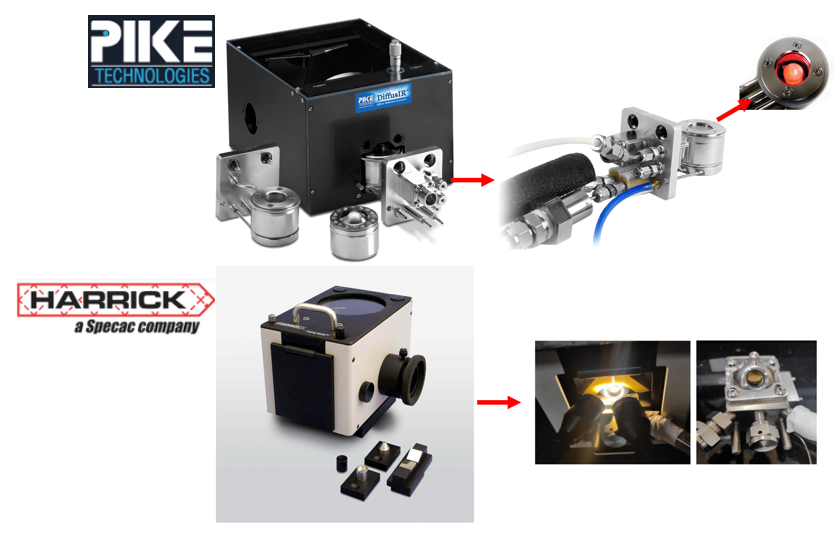 대표적인 구성은 PIKE Technologies의 Heating DiffusIR 또는 HARRICK의 Praying Mantis™ 액세서리를 기반으로 하며, 최대 1000°C 온도 및 1500 psi 고압, 1×10⁻⁶ Torr 진공 환경까지 지원됩니다.