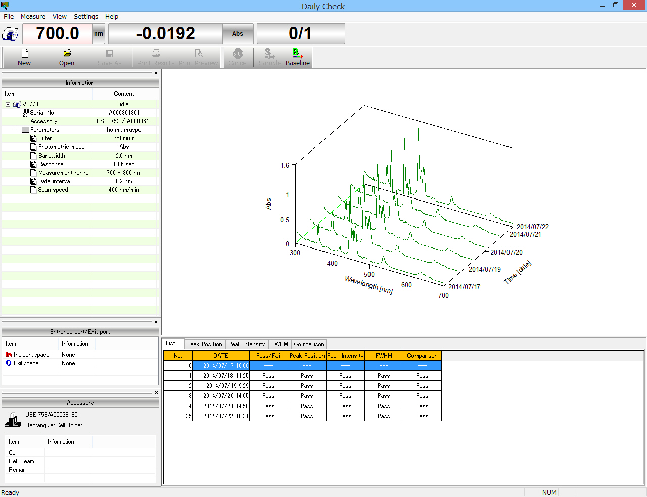 This simple performance check of the spectrophotometer can be made regularly by measuring the absorbance spectrum of a holmium standard supplied with the instrument.