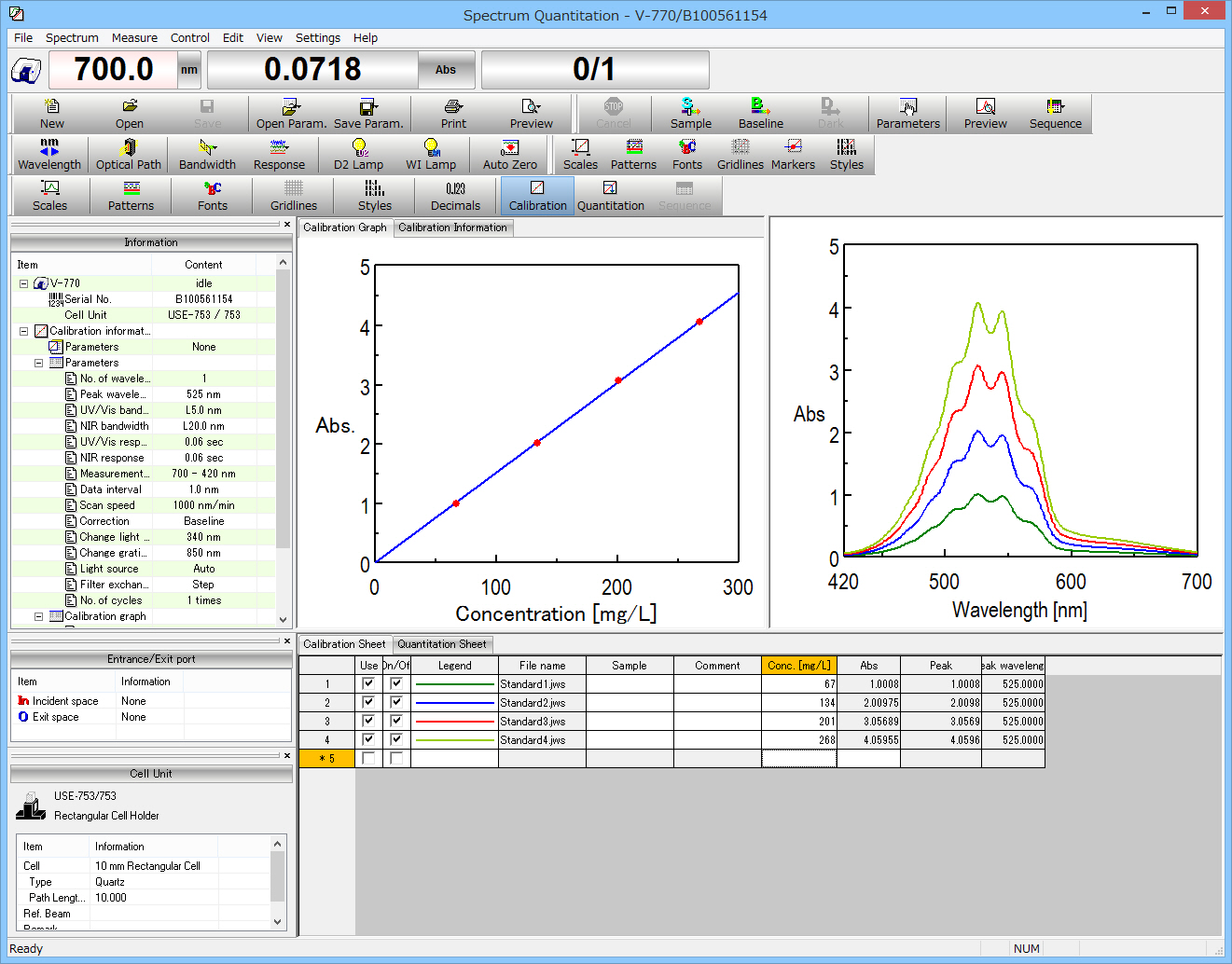 Create a calibration curve using the absorbances of standards with known concentrations, and then use the absorbance for samples with unknown concentrations to interpolate the concentration from the calibration curve. Several peak quantitation methods are included.