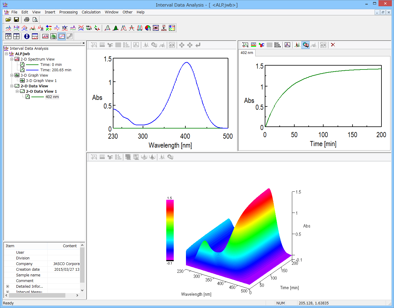 Measure changes with time for sample absorbance at up to four wavelengths, as well as for a selected wavelength range. The measurement time interval can also be set in either minutes or seconds for up to 24 days of continuous measurement (maximum time interval is 1 day). Up to 60,000 spectra can be saved in a single interval scan measurement file.