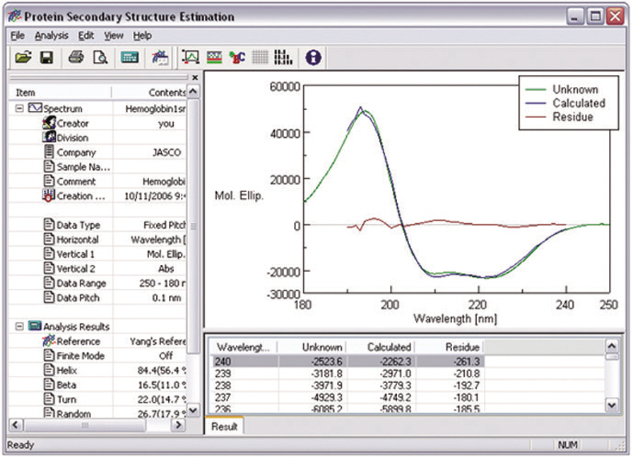 Quantitative multivariate analysis (PCR/PLS) program for the estimation of protein secondary structures from CD spectra. The reference data set supplied includes 26 proteins and is flexible to allow the user to add additional proteins as desired or even create an entirely new reference data set.