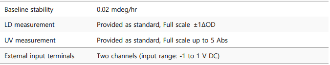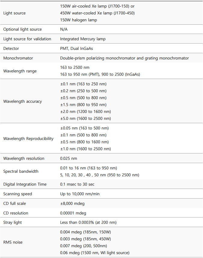 The J-1700 was specifically designed for more demanding near-infrared CD applications. In addition to the enhanced far-UV capabilities, researchers probing the chiral activity of molecules in the NIR spectral region now have the ability to obtain data at wavelengths up to 2500 nm. The InGaAs detector has a wavelength range from 900-2500 nm, while the PMT ranges from 163-960 nm. The automatic detector interchange allows researchers to obtain both far-UV and NIR measurements without having to manually switch detectors. The addition of a grating monochromator to the double-prism monochromator setup provides low stray light and high light intensity, generating CD signals with high S/N performance throughout a large spectral range.