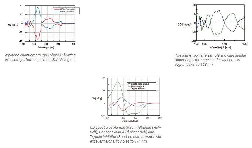 These features ensure that CD spectra can be obtained from strongly absorbing and high signal-to-noise (S/N) samples across the spectrum and into the vacuum-UV region. The quality of spectral data obtained, including data obtained at shorter wavelengths, substantially improves the accuracy of protein secondary structure analysis.