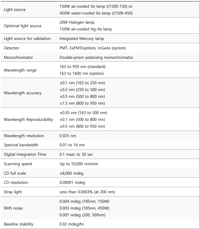 The innovative optical system of the J-1500 permits the measurement of a CD spectrum in the vacuum-UV region down to 163 nm. The enhanced light throughput and new digital lock-in technology now allows for a small signal to be detected in a very noisy environment. Additionally, the optimization of the nitrogen purge efficiency helps to reduce the amount of oxygen in the optical bench so it does not bury the sample signal.