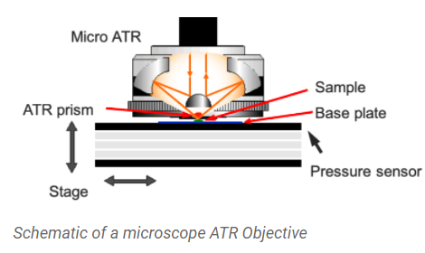 In transmission or reflection the upper cassegrain is typically used to observe the sample prior to measurement, until recently it has been impossible to ‘look though’ an ATR to observe the sample, this means a the upper cassegrain or a refractive objective has to be used for observation and then exchanged with the ATR for measurement; with spatial resolution to single microns, synchronization between the observed and measured images can be challenging.