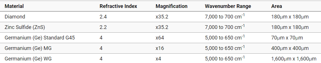 Several different crystal materials used for the prism in the ClearView ATR allowing analysis of different samples different spatial resolutions, penetration depth and wavenumber range.