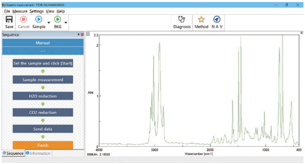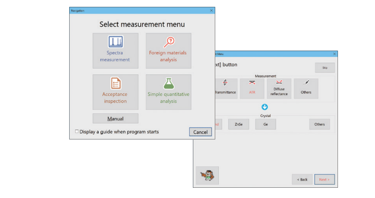 The navigation function allows even those who are unfamiliar with IR analysis to perform measurements in the same way as experts. Measurement parameters suitable for your measurement purpose can be set by selecting menu according to the navigation.