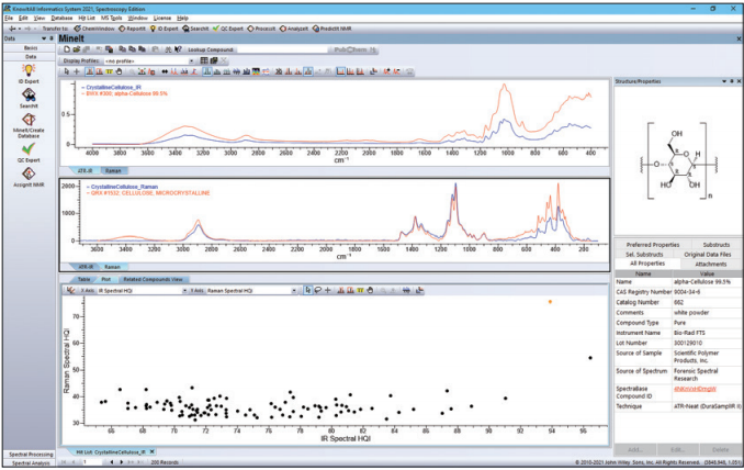 Simultaneous search function for IR and Raman spectra about the same sample and plot function of the hit rates of each search result against each other.
