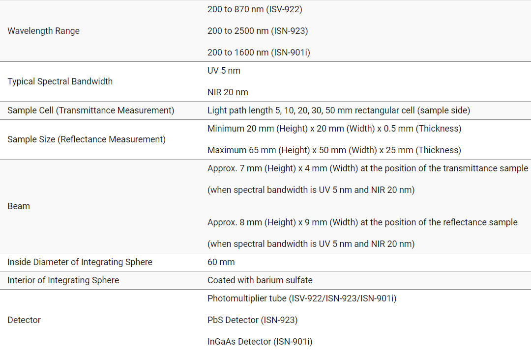 All JASCO Integrating spheres include built in detectors for optimal sensitivity – PMT for UV-visible, InGaAs up to 1600nm and PbS up to 2500nm.
