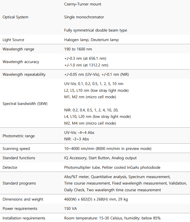 A PMT detector is used for the UV-Visible region and a high sensitivity InGaAs detector in the NIR region. Both gratings and detectors are automatically exchanged within a user selectable range of 800 to 900nm.