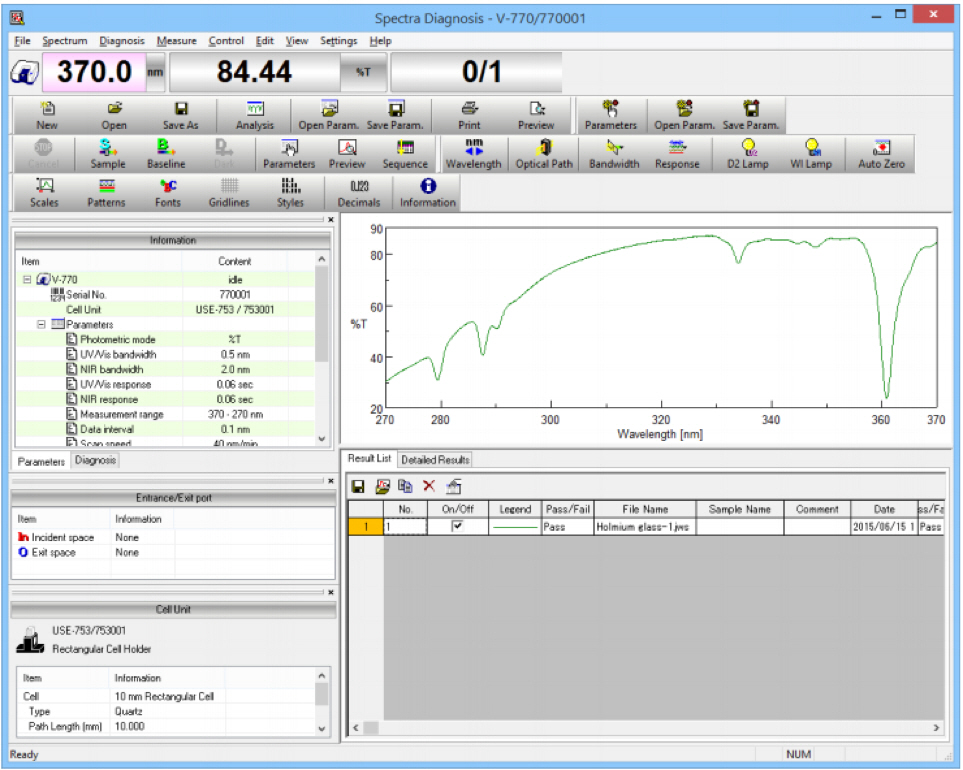 Perform data processing with pass/fail evaluation on a measured spectrum based on photometric values at a specified wavelength, full width at half maximum, peak photometric values, peak wavelengths etc.